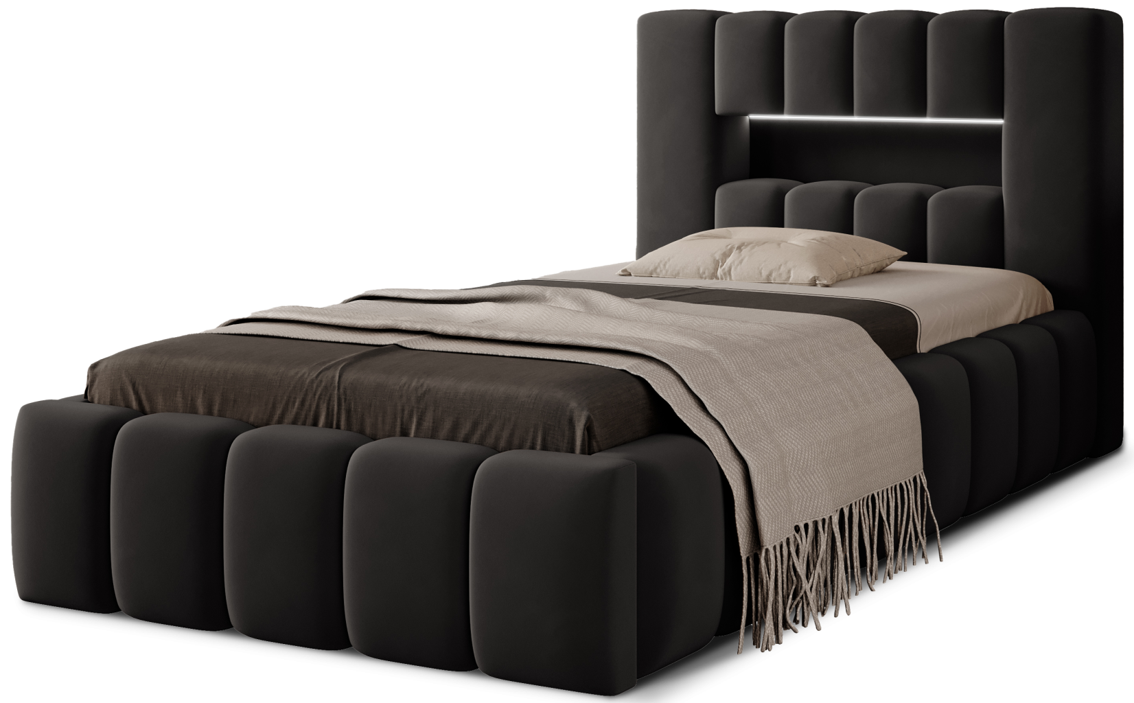 Dotaz na produkt Na splátky ještě dnesLamica je velmi pohodlná, měkká a originální postel v glamour stylu, která zaujme svým neobvyklým tvarem a formou. Tento kus nábytku se skládá z korpusu a dřevěného rámu. Součástí je také přihrádka na ložní prádlo. Rozměry spací plochy 90x200 cm poskytují dostatek prostoru pro nerušený odpočinek. Naše postel vyniká svou kvalitou, protože vysoké čelo a boky postele jsou vyrobeny z dodatečné pěny. Estetický zážitek je umocněn podélným, rozsáhlým prošíváním. Široká škála barevných provedení usnadňuje sladění postele s celým pokojem. Další výhodou je opěrka hlavy s LED osvětlením, díky čemuž je odpočinek ještě příjemnější. Modernita a modernistický vzhled zde jdou ruku v ruce s elegancí, což dělá z Lamicy perfektní volbu v každém případě. Je to kus nábytku, který stojí za to mít. Látky: Nube 6