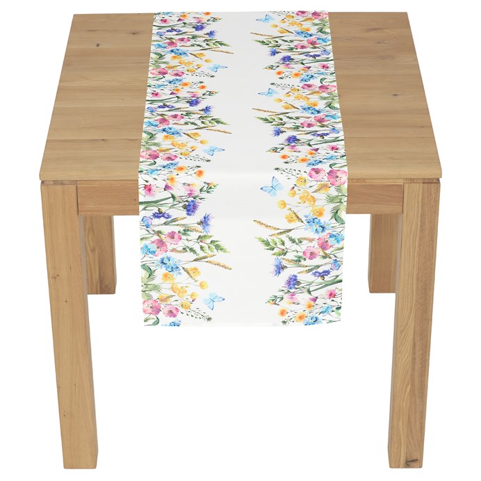 Dotaz na produktBěhoun s jarním květinovým motivem je vyroben z 100% polyesteru, který se snadno udržuje a zachovává si stálost barev. Jeho bílý podklad zvýrazňuje barevné květy a motýly v jemných odstínech modré, žluté a růžové, což přináší svěží atmosféru do každého interiéru. Rozměry 40 x 150 cm umožňují univerzální použití na jídelní stoly i komody. Polyesterové provedení zajišťuje odolnost proti pomačkání a rychlé schnutí, což usnadňuje každodenní péči. Běhoun je vhodný pro doplnění jarního nebo letního dekoru s důrazem na přírodní motivy.