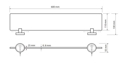 šířka 600 mmhloubka 130 mmvýška 55 mmmateriál mosaz, mléčné sklopovrchová úprava chrommontáž vrtánímPARAMETRY:Barva: chrom;ostatníDruh: policeMateriál: kov;skloMontáž: vrtáníVýrobce: Bemeta