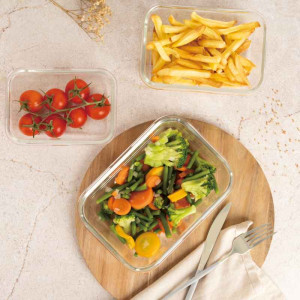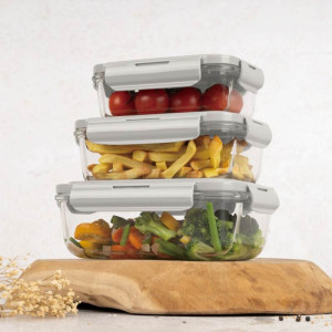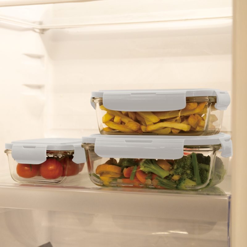 Elegantní a praktická sada nádob na skladování potravin z odolného borosilikátového skla.