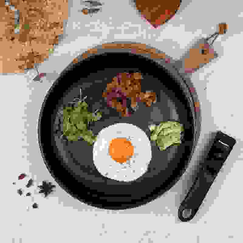Minimalistický matný povrch v kombinaci modré a šedého dřeva dodává sadě elegantní vzhled, zatímco turbo indukční dno zajišťuje rychlé a rovnoměrné vaření. Víka z tvrzeného skla se systémem Soft Close umožňují bezpečné manipulování a kontrolu vaření.