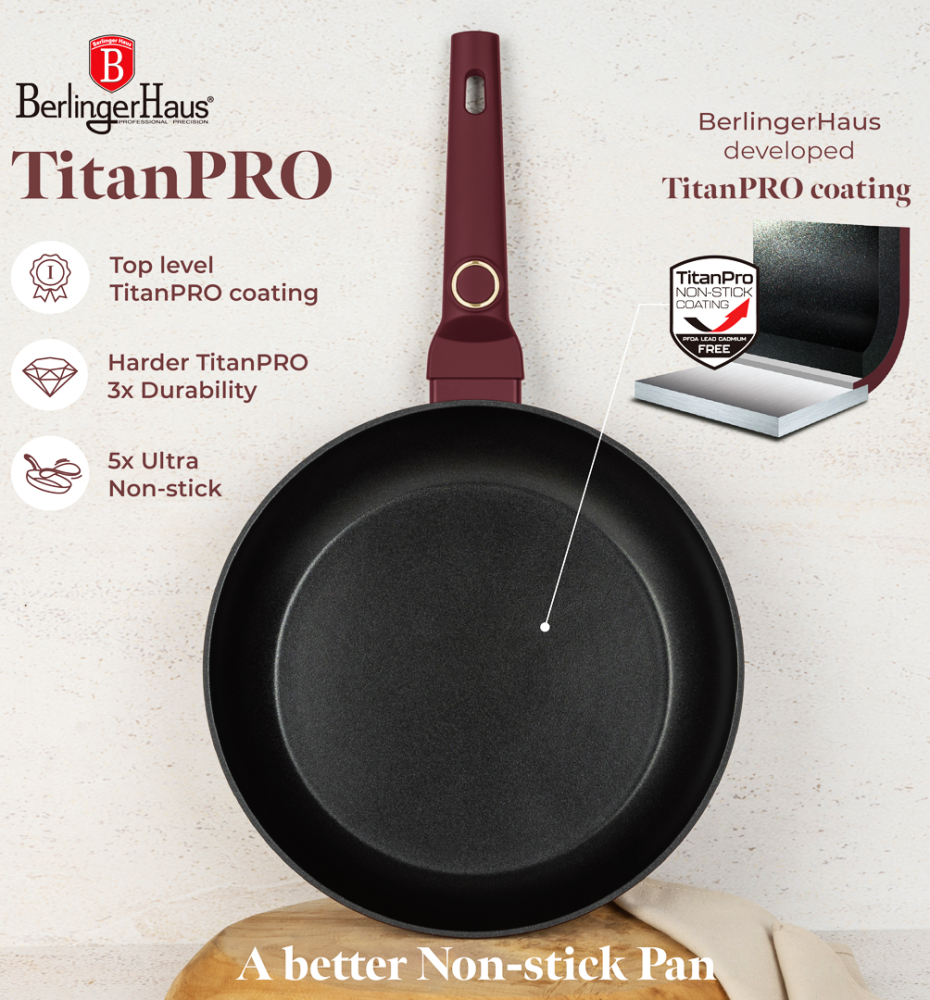 • Povrch: 3vrstvý nepřilnavý povrch TitanPro – mimořádně odolný proti poškrábání, vhodný pro zdravé vaření s minimem tuku