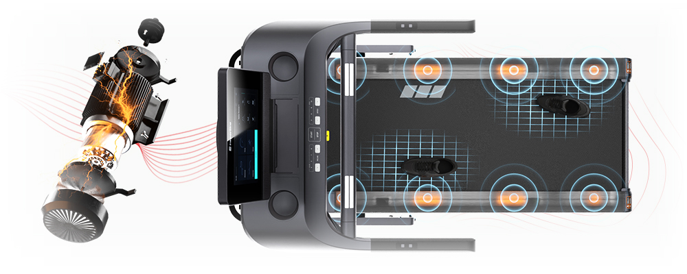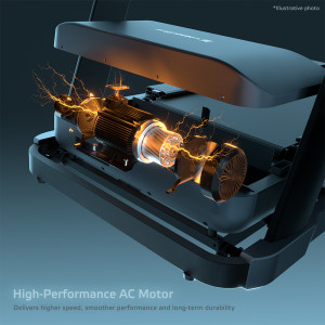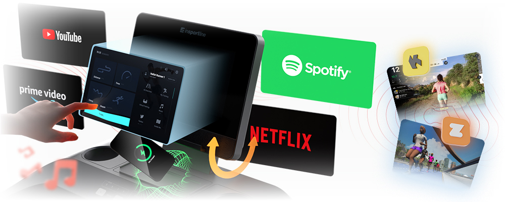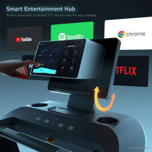 Na první pohled Vás zaujme 15,6" dotykový TFT displej, který se postará nejen o přehledný přehled všech tréninkových údajů, ale i o zábavu během cvičení. Předinstalované aplikace jako YouTube, Netflix, Spotify, Facebook, Chrome či Prime Video zpříjemní každou minutu na pásu. Samozřejmostí je Bluetooth propojení s telefonem a bezdrátové i USB dobíjení a Touch & Run ovládání na madlech pro rychlé úpravy sklonu i rychlosti.