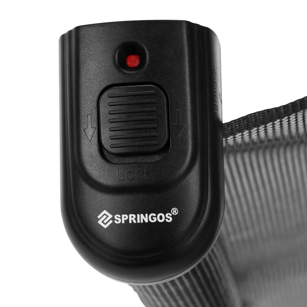Bezpečnostní zábrana rolovací SPRINGOS HA7525 černá 162×86 cm je praktickým řešením pro zabezpečení prostoru v domácnosti. Slouží jako bezpečnostní zábrana do dveří i na schody a díky roztažitelné rolovací konstrukci se snadno přizpůsobí různým šířkám průchodů. O komfortní používání se stará tichý a plynulý chod mechanismu, zatímco bezpečnostní indikátor v horní části jasně ukazuje stav – červená barva značí zamčeno, zelená odemčeno.