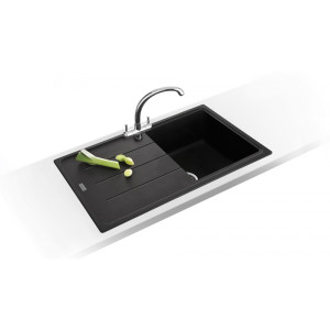 Fragranitový dřez Basis. Cena zahrnuje: Sítkový ventil 3 1/2“ s přepadem. Sifon pro úsporu místa 6/4“ s odbočkou na myčku nádobí. 2 Místa pro vyvrtání otvoru.Pozor! Baterie je umístěna ve vyspádované odkapávací ploše a je mírně nakloněna.