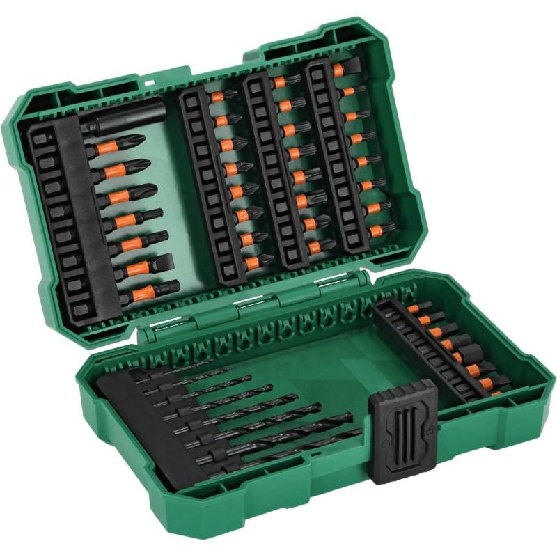 • sada obsahuje rázové bity z oceli S2 v různých provedeních, také vrtáky z rychlořezné oceli HSS, které lze použít k vrtání do různých kovů a tvrdých dřev