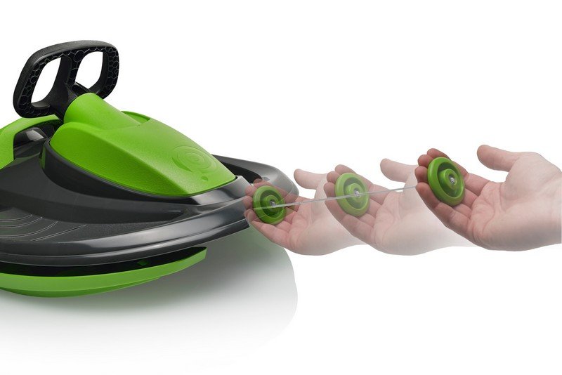 Stylový design závodní formule. Středová brzda pro větší bezpečí. Originální provedení se čtyřmi lyžinami. Zaručuje snadné zatáčení. Zatáčení pomocí diferenciálu zvyšuje rychlost v zatáčkách, protože každá lyže může zatočit pod jiným úhlem. Samonavíjecí mechanismus tažného lana. Masivní brzda s pružinou pro navrácení do původní polohy. Žádné kovové prvky ani šrouby, nemusíze mít obavu z koroze a montáž není nutná.
