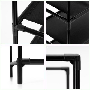 Botník je vyroben z odolné kovové konstrukce, která zajišťuje vysokou stabilitu a dlouhou životnost. Každá police má nosnost až 10 kg, celkové maximální zatížení činí až 100 kg, což zaručuje bezpečné uložení i těžší obuvi. Otevřený design podporuje dobrou cirkulaci vzduchu, díky čemuž boty lépe vysychají a zůstávají svěží.