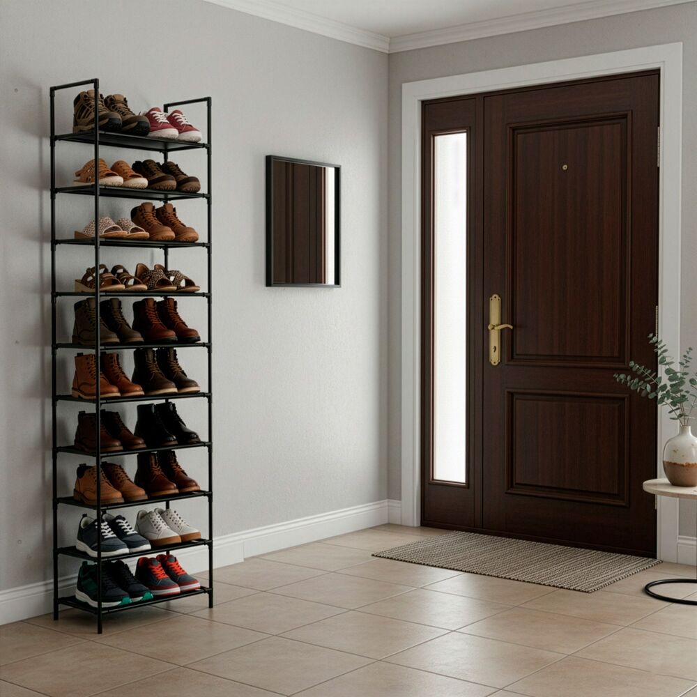 Kovový botník 10 polic SPRINGOS HA7550 černý je praktickým řešením pro přehledné uložení velkého množství obuvi v předsíni, chodbě nebo šatně. Díky deseti policím nabízí dostatek prostoru pro každodenní i sezónní boty celé rodiny. Vysoké a úzké provedení efektivně šetří místo a umožňuje využít i menší prostory bez omezení průchodu.