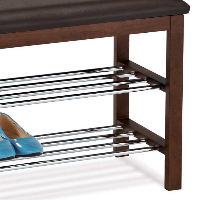 Botník s taburetem v hnědém odstínu je vyroben z masivu kaučukovníku s mořením na ořech, což zajišťuje pevné a stabilní tělo. Sedák je potažen kvalitní hnědou ekokůží, která se snadno udržuje a přispívá k pohodlnému sezení. Dvě chromované police nabízejí praktický prostor pro uložení obuvi, přičemž jejich lesklý povrch kontrastuje s teplým dřevem rámu. Kompaktní rozměry a pevné provedení umožňují využití v předsíních i menších prostorách. Celková kombinace materiálů a designu vytváří funkční a estetický doplněk interiéru.