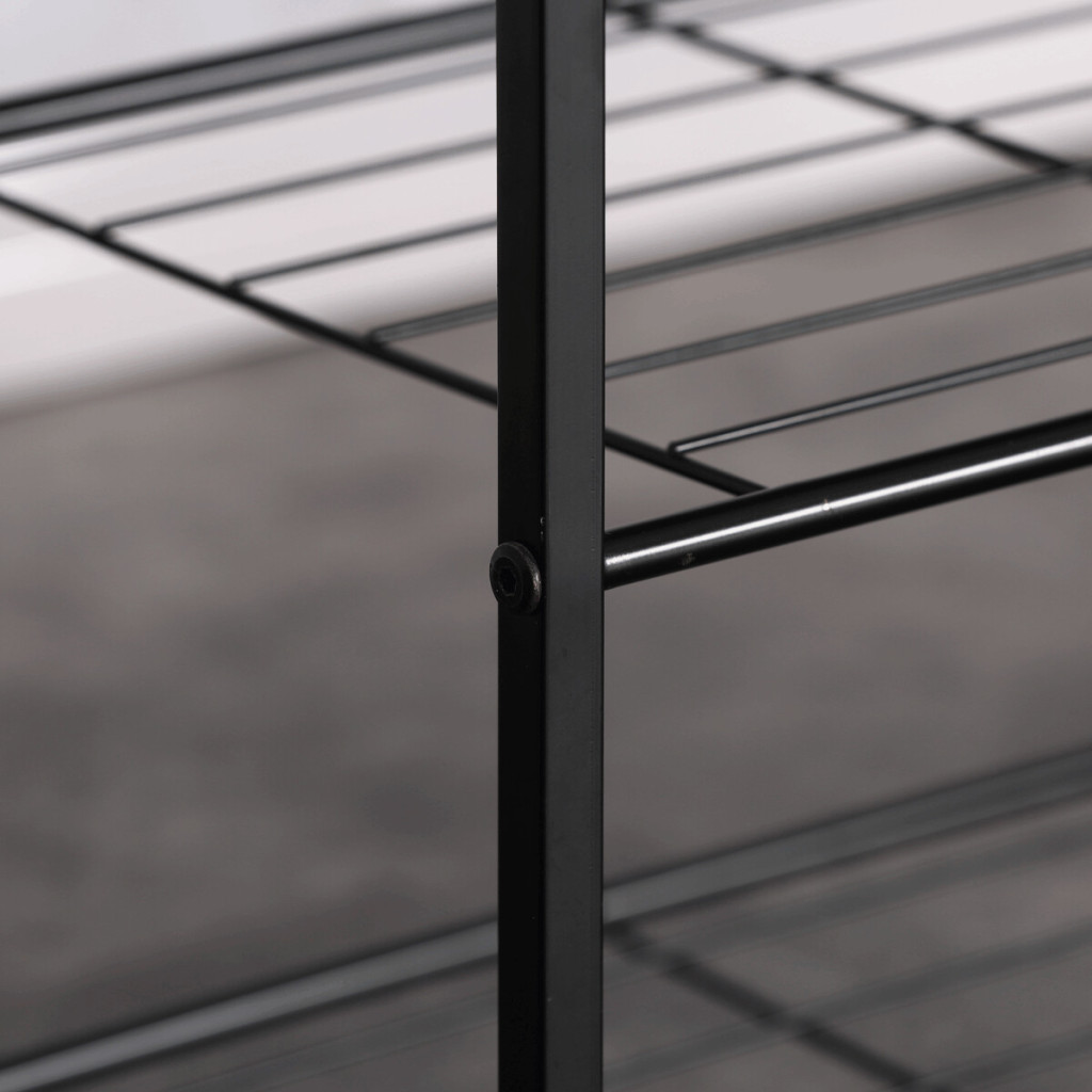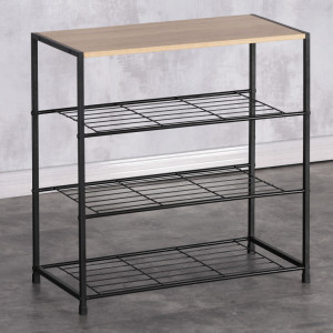 Dotaz na produktBotník s konstrukcí a odkládacími plochami z lehkého kovu v černé barvě. Půda je vyrobena z MDF desky s povrchovou úpravou 3D folie v odstínu dub sonoma.
