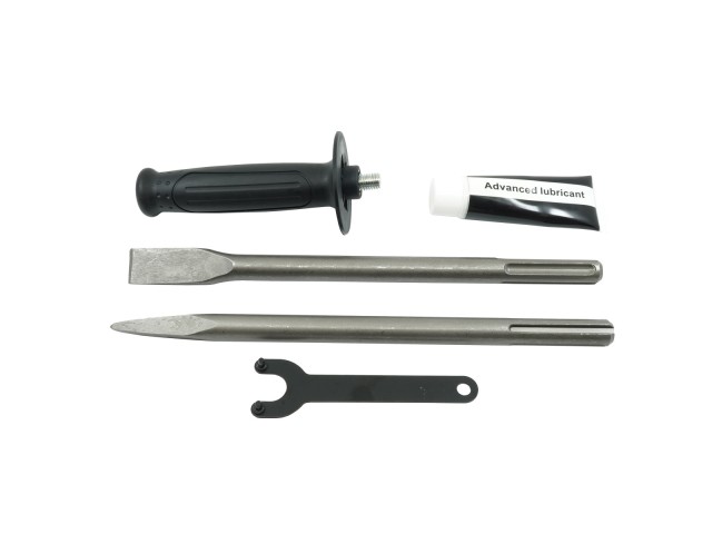 1ks rukojeť 1ks špičatý sekáč 18x320mm 1ks plochý sekáč 18x320mm 1 pár uhlíků 1ks mazivo 1ks klíč