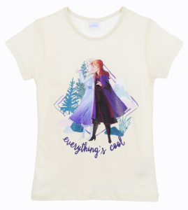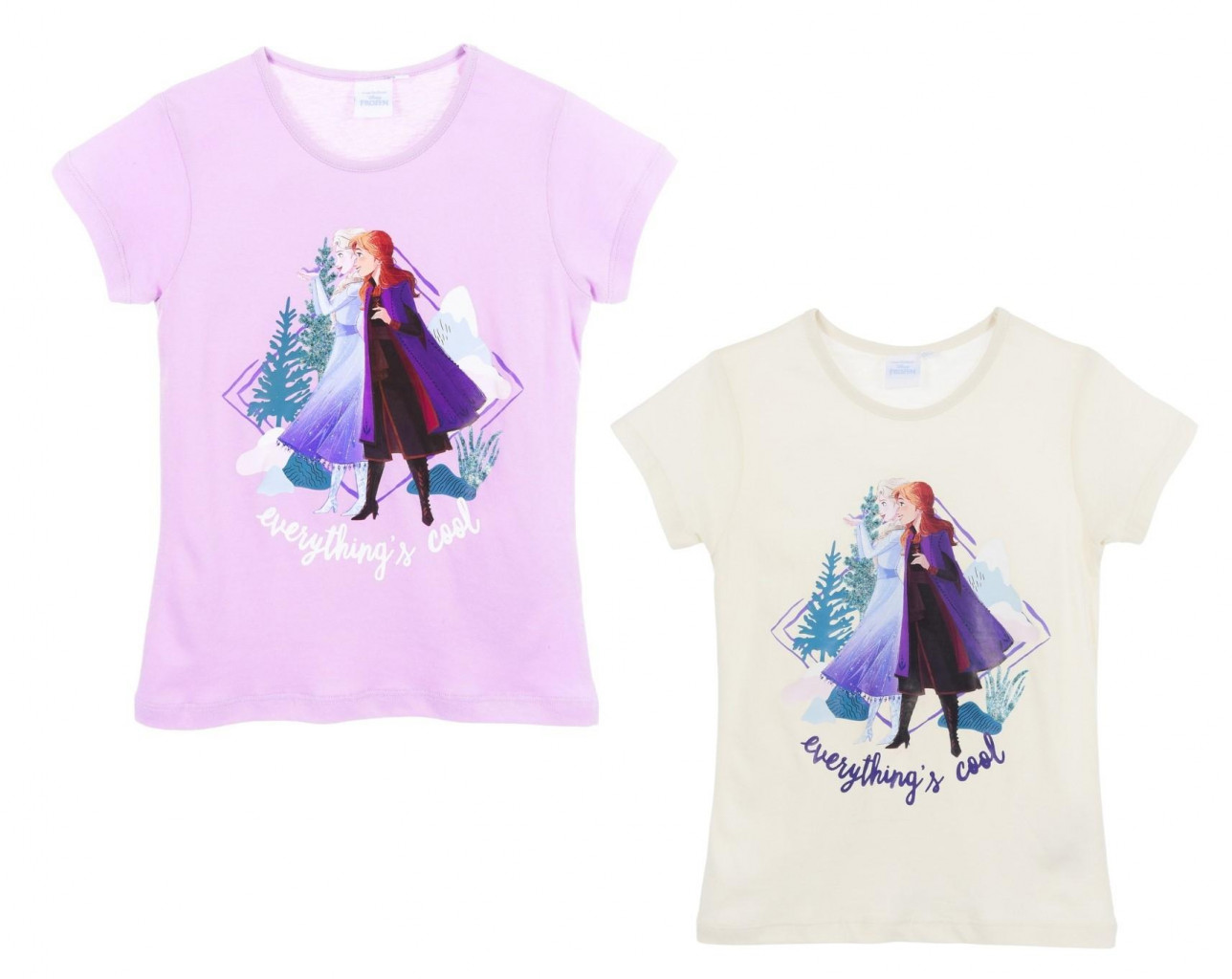Tričko Frozen. Box 24 ks: velikosti 3x (4,5,6,8) od každé barvy. Barva: krémová, fialová. Materiál: 100% bavlna. Oficiální licence, Sun City.