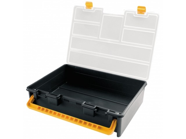 Plastový organizér 443 x 317 x 107 mm, s průhledným víkem Řada malých kufříkových přihrádek na nářadí ze série VALENTINO nabízí širokou škálu velikostí a modelů. Všechny organizery jsou vybaveny průhlednými protinárazovými víky