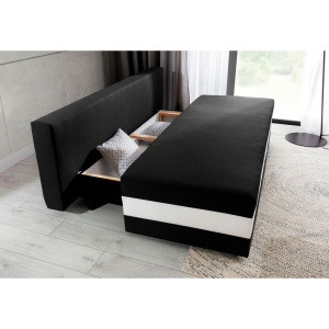 Dotaz na produkt Na splátky ještě dnesCalia je jednoduchá a vkusná pohovka o rozměrech 195 x 91 x 83 cm, která je stvořena pro milovníky minimalistických provedení. Je ideální pro relaxaci ve dne i v noci, protože může mít podobu postele o rozměrech 195 x 140 cm. Za zmínku stojí také prostorný úložný prostor na ložní prádlo a další dekorativní polštáře. Náš kus nábytku je laděn v jednotném odstínu, který je prolomen širokým pruhem procházejícím spodní částí sedáku. Kromě designového provedení stojí za zmínku i výplň naší pohovky, jejíž sedák je vybaven vlnitou pružinou a pěnou T25. Calia zaujme svou jednoduchostí a minimalismem s charakterem. Kombinuje maximální pohodlí s útulnými prvky, které budou perfektní výplní každého bytu.Látky: Sawana 14, Soft 17, Zigzag 60