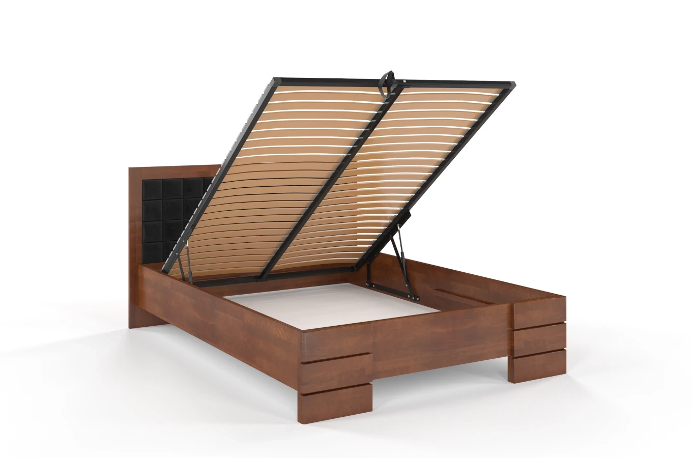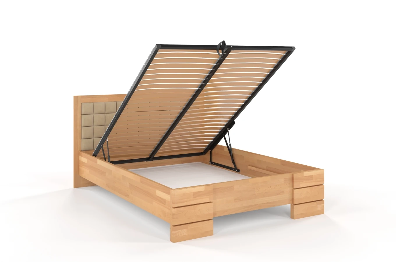 Charakteristickým rysem postele Visby GOTLAND High & BC & Long je praktická lůžkovina, která se díky plynovým pohonům a speciální plastové rukojeti ve tvaru obrácené kotvy mírně otevírá a pevná čalouněná opěrka hlavy uzavřená v dřevěném rámu.