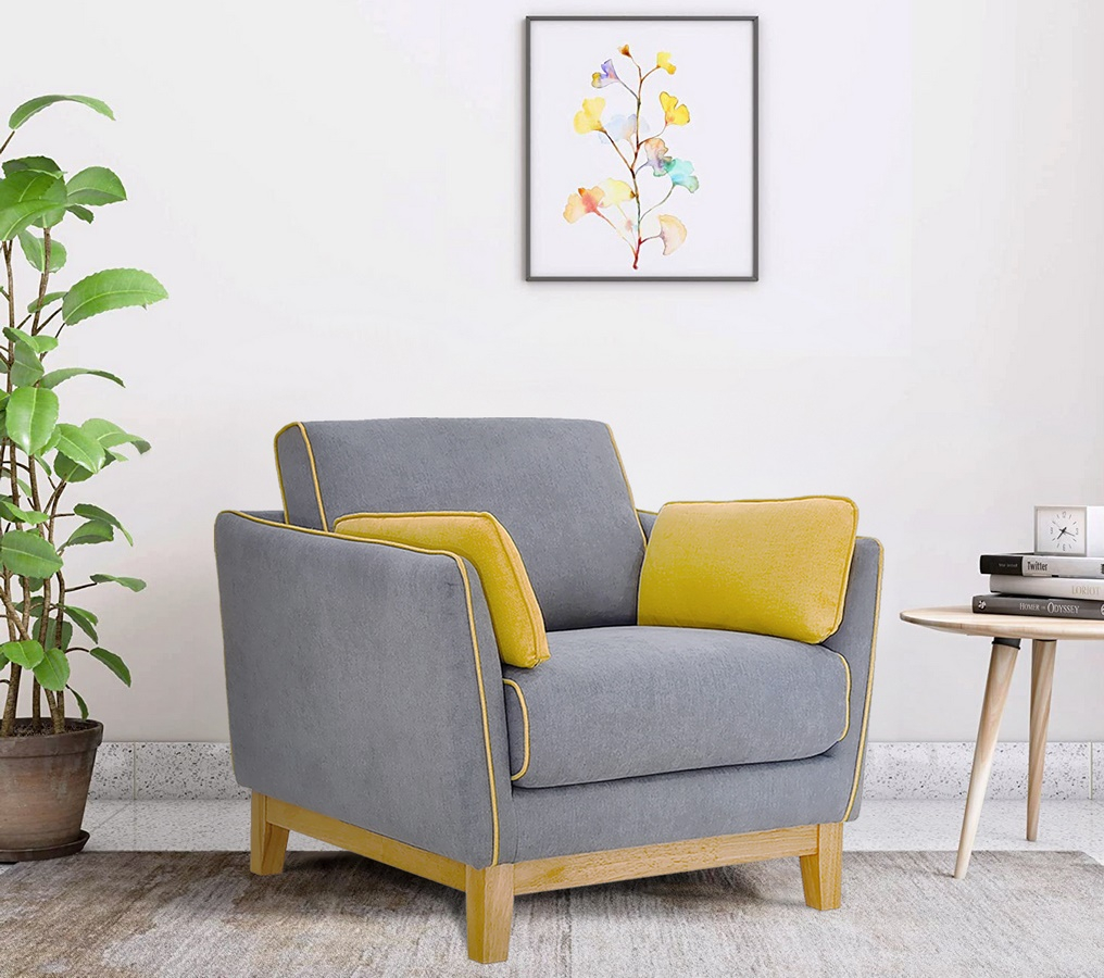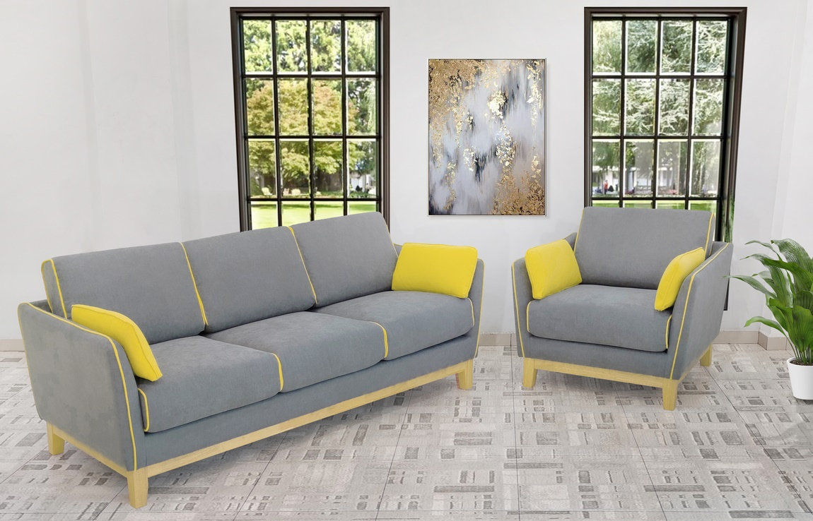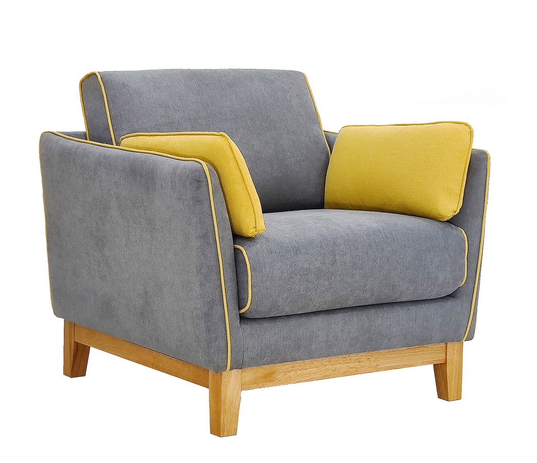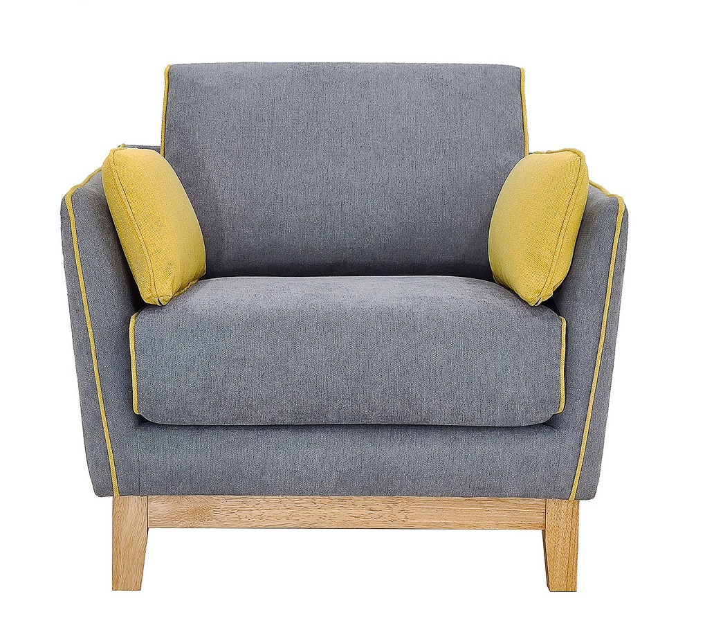 Dotaz na produkt Na splátky ještě dnesElegantní celočalouněné křeslo bude ozdobou každého interiéru. Konstrukce je ze dřeva v barvě teak, čalounění je z látky dle vyobrazení šedé barvy doplněné o ozdobný lem hořčicově žluté barvy. Dekorativní malé polštáře mají snímatelný a pratelný potah. Pohodlí a elegance v kvalitním provedení ve Vašem obýváku, jídelně či kanceláři. Výška sedu je 47 cm a hloubka sedu je 51 cm. Dekorační polštářky jsou v ceně. DOPRODEJ!