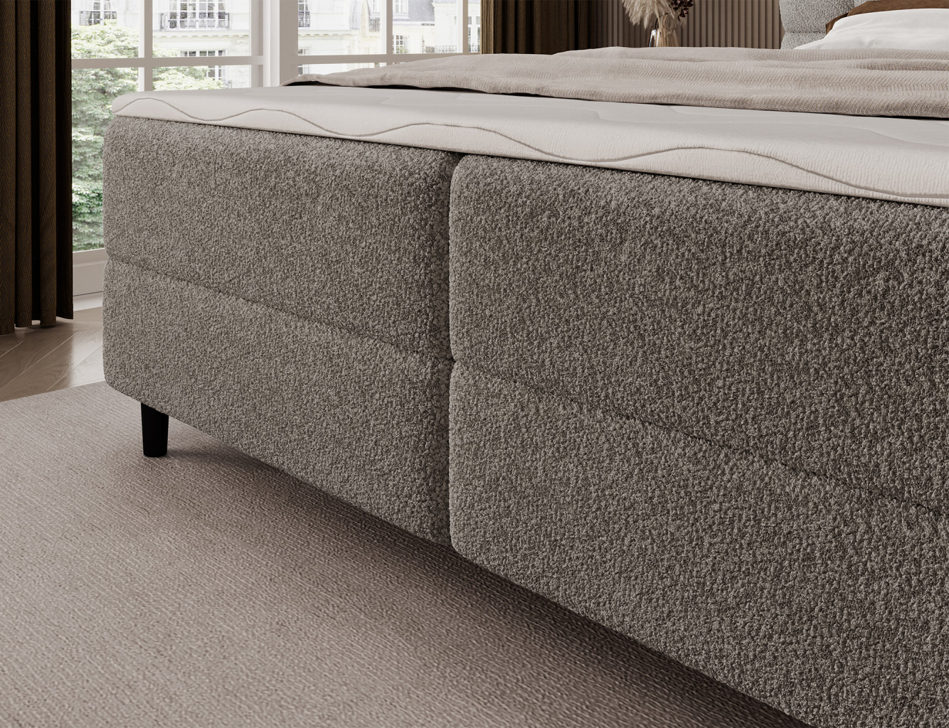 Dotaz na produkt Na splátky ještě dnesKontinentální postel Camma kombinuje moderní design, funkčnost a vynikající pohodlí při spaní, což z ní činí perfektní volbu pro elegantní a praktickou ložnici; k dispozici ve třech velikostech – 140x200 cm, 160x200 cm a 180x200 cm – dokonale se přizpůsobí prostoru i individuálním potřebám, zatímco její pevná konstrukce s celkovou výškou 102 cm a výškou sedáku 56 cm zajišťuje každodenní pohodlí; postel má hloubku 222 cm a šířka závisí na zvoleném modelu – 162 cm, 182 cm nebo 202 cm – což jí dodává stabilní a působivý vzhled, který dodá luxusní nádech každému interiéru; čalouněná vysoce kvalitní, měkkou látkou se stylově prošívaným čelem kombinuje moderní eleganci s pohodlnou oporou pro čtení nebo relaxaci; praktický úložný box poskytuje prostor pro ložní prádlo a pomáhá udržovat v ložnici pořádek, díky čemuž je postel Camma nejen pohodlná, ale i vysoce funkční; design doplňují 10cm černé dřevěné nohy, které dodávají vizuální lehkost a usnadňují úklid pod postelí; Model Camma je ideální volbou pro ty, kteří si cení moderního stylu, elegance, odolnosti a pohodlí a zajišťují zdravý a klidný spánek každou noc. Látka: Royal 20