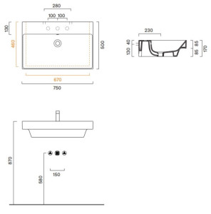 - instalace k zavěšení na zeď nebo polozápustná instalace do desky