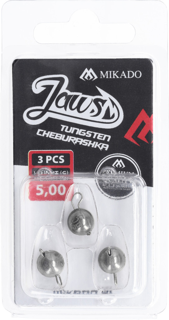 vaha: 5 Univerzální sada wolframových čeburašek JAWS určená pro lov s gumovými nástrahami. Kombinace pěti nejoblíbenějších gramáží umožňuje přizpůsobit se různým hloubkám a proudům. Díky vyšší hustotě wolframu jsou čeburašky menší než olověné, což zlepšuje nához i vedení nástrahy.