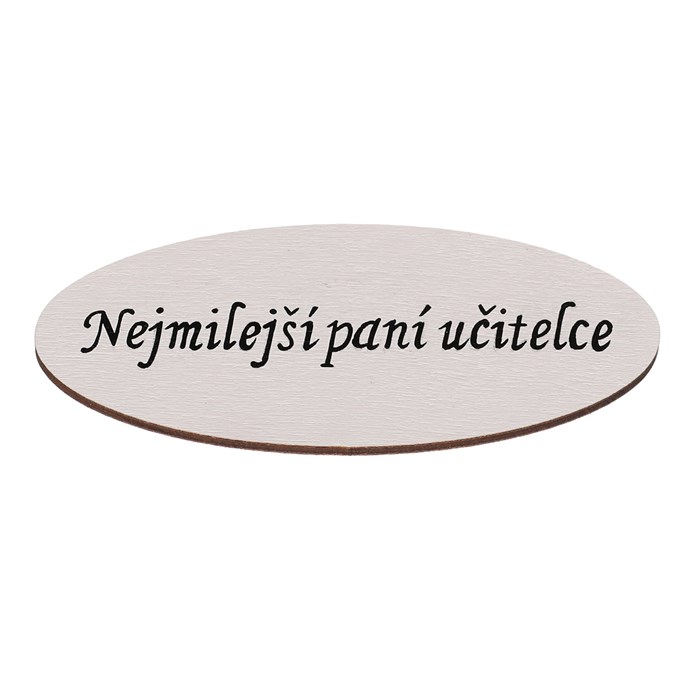Dotaz na produktChystáte se udělat radost své oblíbené učitelce hezkým dárkem a rádi máte věci promyšlené do nejmenších detailů? V tom případě by i drobné cedulky s nápisy a věnováním neměly chybět ve vaší sbírce dekorací. Právě tato oválná dřevěná cedulka s černým nápisem „Nejmilejší paní učitelce“ bude milým důkazem toho, že si jí vážíte.
