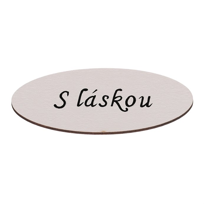 Dotaz na produktChystáte se udělat radost své milované osobě hezkým dárkem a rádi máte věci promyšlené do nejmenších detailů? V tom případě by i drobné cedulky s nápisy a věnováním neměly chybět ve vaší sbírce dekorací. Právě tato oválná dřevěná cedulka se zdobným nápisem „S láskou“ bude milým důkazem vašich citů k dané osobě.
