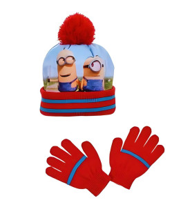 V provedení červená. Čepice a rukavice Mimoni. Svrchní materiál: samet, 100% polyester. S flísovou podšívkou, 100% polyester. Rukavice 100% acrylyc. Oficiální licence.