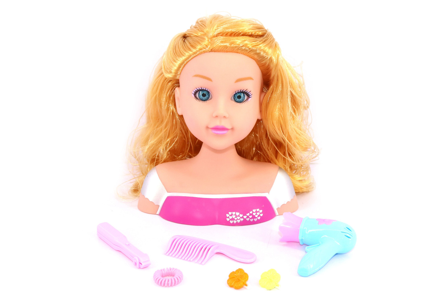 Dotaz na produktČesací hlava set. Velikost 22 cm. Obsah - hlava, fén, kulma, hřeben, 2 sponky, gumička.