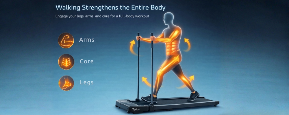 Chodící pás inSPORTline Tyrion je ideální volbou pro každého, kdo chce zůstat aktivní i v omezeném prostoru domova. Nabízí nejen klasickou chůzi, ale díky speciálním postranním madlům umožňuje také simulaci nordic walkingu, při kterém efektivně zapojíte celé tělo. Vyniká mimořádně skladnou konstrukcí s výškou pouhých 13 cm ve složeném stavu, jednoduchým ovládáním, tichým chodem a komfortní běžeckou plochou šetrnou ke kloubům. Samozřejmostí je nastavení rychlosti v rozmezí 1–8 km/h, přehledný LED displej i praktické transportní prvky.