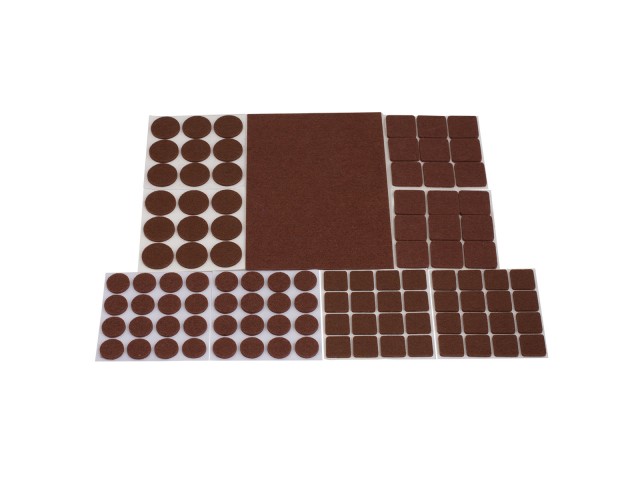 sada samolepicích filcových podložek pod nábytek v hnědé barvě, 18x čtverec 2,8x2,8cm, 32x čtverec 1,9x1,9cm, 18x kruhový 2,6cm, 32x kruhová 2cm a 1x deska 18x12,5cm pro vystřižení požadovaného rozměru.