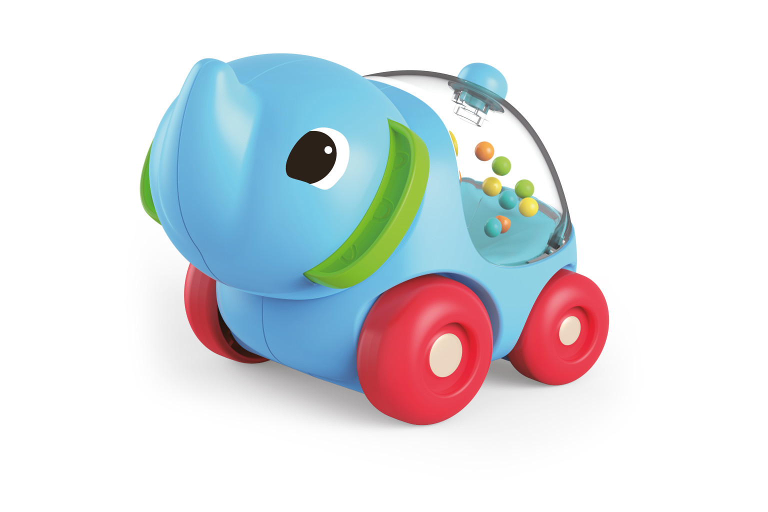 Dotaz na produktChrastítko slon na kolečkách. Rozměry hračky 8,3x11x9 cm. Při jízdě chrastí.