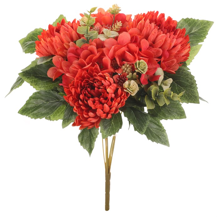Dotaz na produktUmělá kytice s chryzantémami a hortenziemi v oranžových odstínech přináší do interiéru živý a barevný akcent po celý rok. Květiny jsou vyrobeny z textilu, který věrně napodobuje přirozenou strukturu a tvar okvětních lístků. Zelené listy doplňují celkový vzhled a vytvářejí přirozený kontrast s výraznou barvou květů. Kytice je vhodná pro aranžmá na stůl, komodu nebo jako dekorace v prostoru, kde oceníte trvalou barevnost bez nutnosti údržby.