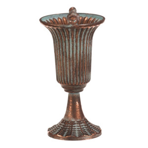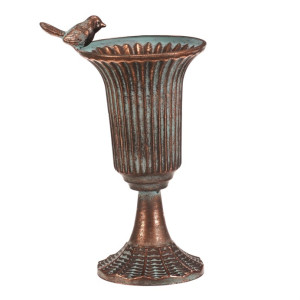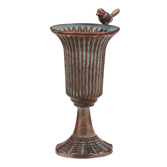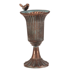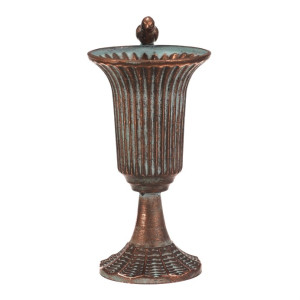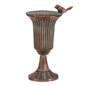 Dotaz na produktKovová číše v měděném odstínu zaujme svým vintage vzhledem a detailním reliéfním provedením. Její tvar připomíná klasickou pohárovou nádobu s rozšířeným okrajem, který je ozdoben malou figurkou ptáčka, jež dodává dekoraci osobitý charakter. Stabilní základna s jemnou texturou zajišťuje pevné postavení. Číše je vhodná jako dekorativní prvek do interiérů laděných do retro nebo industriálního stylu, kde vynikne její kovový lesk a patina.