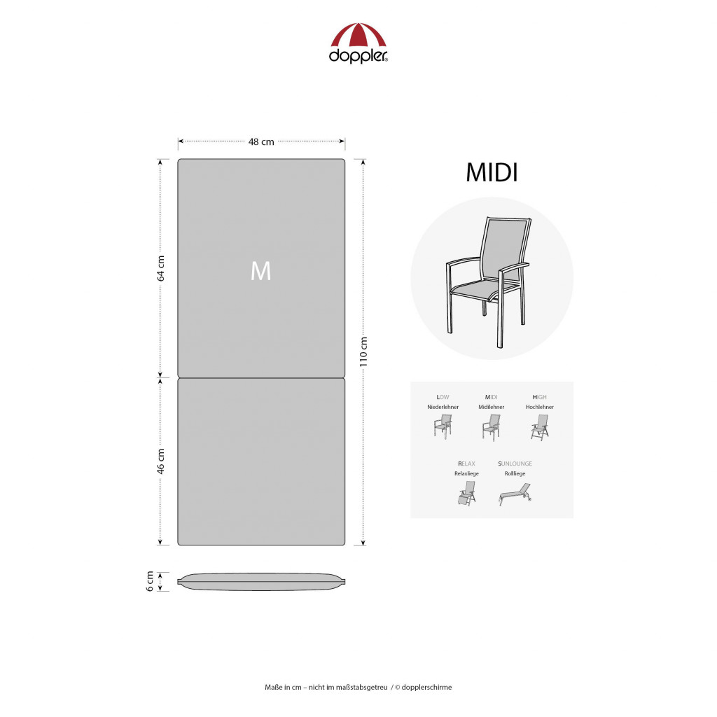 - polstr na židli a křeslo Polstr se střední opěrkou na zahradní nábytek řady CITY. Elegantní polstr v módním odstínu, zdobený výšivkou Doppler na opěradle. Polstr je v provedení s obšitým lemem, prošitý 1x v sedáku, 1x v opěradle. Uchycení je pomocí posuvné spony. Díky sponě si můžete nastavit velikost dle rozměru a druhu židle, spona je pevná a nevytahuje se. Upevnění sedáku je pomocí dvou tkaniček v ohybu polstru. Síla polstru je optimální pro všechny druhy židlí. Provedení je vhodné i do náročných podmínek kaváren, zahrádek a restaurací. Potah je nesnímatelný.Vyrobeno v České republice. Informace o produktu: rozměry polstru: 110 x 48 x 6 cm (výška x šířka x tloušťka) rozměry sedáku: cca 46 x 48 cm rozměry opěradla: cca 64 x 48 cm Materiál potah: 100procent evropský polyester, s velmi dobrou stálobarevností a odolností vůči oděru. výplň: molitan obalený do polyesterového rouna Celkové rozměry podušek jsou uváděny s tolerancí plus /