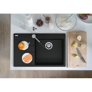 Fragranitový dřez Centro. Cena zahrnuje: Vymezovací podložku pro montáž kuchyňské baterie. Sítkový ventil 3 1/2“ s přepadem. Sifon pro úsporu místa 6/4 “ s odbočkou na myčku nádobí. 5 Míst pro vyvrtání otvoru. Možnost umístit dávkovač saponátu. Fixační příchytky Fast-Fix. Moderní linie, jemně zaoblené hrany, k okraji mizející drážky, tenký profil. Svěží a atraktivní design.