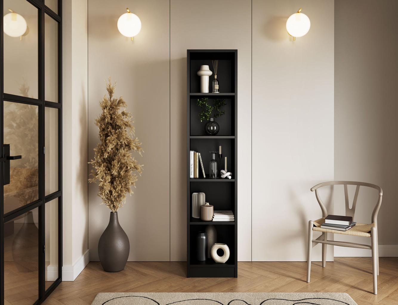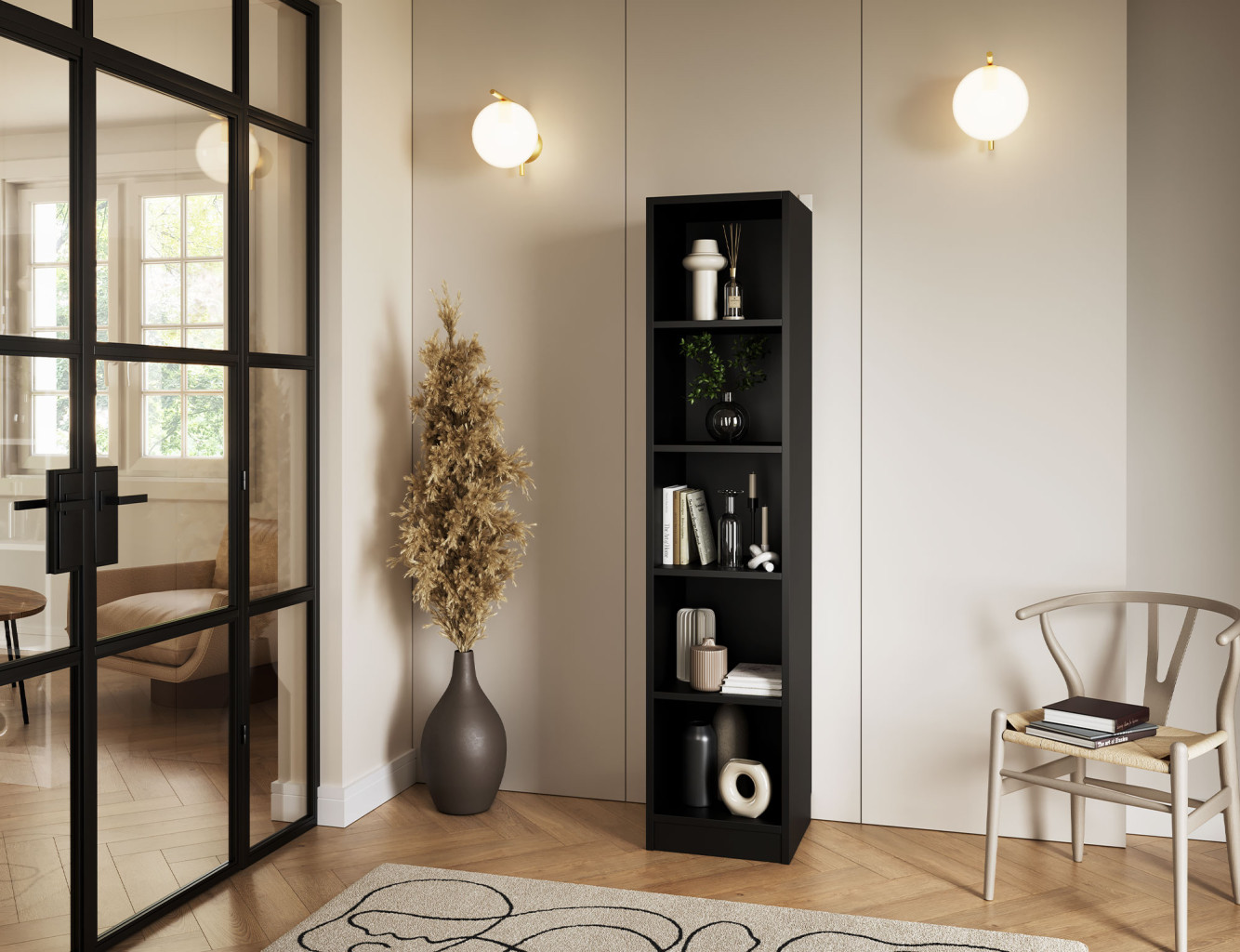 Dotaz na produkt Na splátky ještě dnesPolice Craft je praktický a stylový kus nábytku, který se perfektně hodí do každého interiéru. S rozměry 40 cm na šířku, 180 cm na výšku a 40 cm na hloubku poskytuje dostatek úložného prostoru pro různé předměty. Zásuvka s nosností až 3 kg je ideální pro drobné doplňky, zatímco černé plastové kluzáky zajišťují stabilitu police a chrání podlahu před poškrábáním.Látka: Černá
