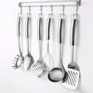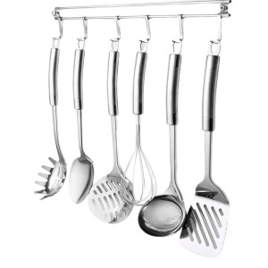 Dotaz na produkt-Materiál: nerezová ocel/chrom/nikl-barva: stříbrná-kombinace matného a leštěného povrchu-sada obsahuje:-naběračka, naběračka na špagety-servírovací lžíce, šlehací metla-pěnovačka, obracečka -délka lišty: 40cm