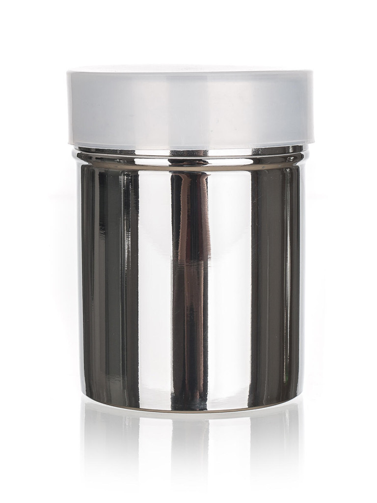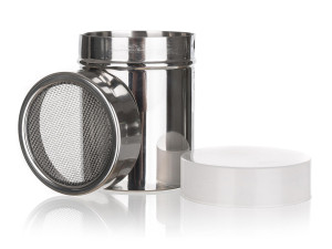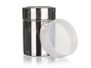 Nerezová cukřenka s plastovým víčkem AKCENT má jemné sítko, které je vhodné např. na moučkový cukr.