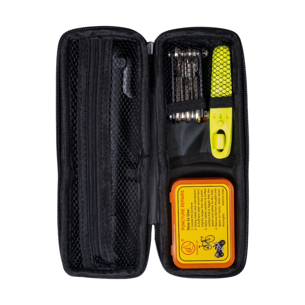 V přehledném obalu, který se navíc pohodlně vejde do košíku na láhev, najdete pumpičku s vestavěným tlakoměrem, multifunkční nářadí se šesti imbusy, šroubováky i torx klíčem a kompletní sadu na opravu defektu s lepidlem, záplatami a zdrsňovačem.