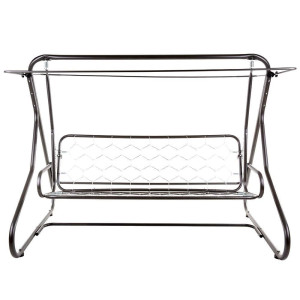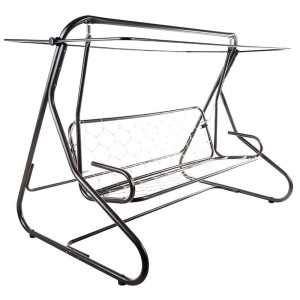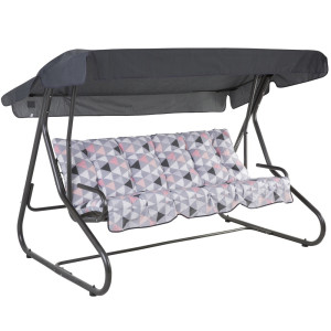 Houpačka pro 3 osoby s rozkládací sedačkou upevněnou na pružinách. Solidní, pevná konstrukce. Rám malovaný práškovou polyesterovo-epoxidovou antracitovou barvou. Sedadlo lze sklopit do ležící polohy. Stříška vyrobena z polyesteru, má speciální tunely přizpůsobené ke střešní konstrukci houpačky. V sadě také 2 prošívané sedáky. Vrch sedáku z bavlny, spodek z lustrasilu. Obšito lemem z polyesteru. V opěrné části šňůrky pro připevnění k rámu. Stříška z bavlněné tkaniny.