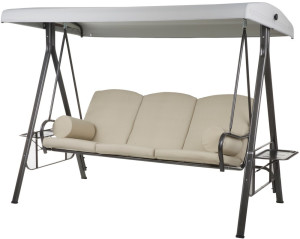 Houpačka pro 3 osoby s nastaviteným sklonem zádové části. Solidní, pevná konstrukce. Rám stříkaný práškovou polyesterovo-epoxidovou antracitovou barvou. Stříška vyrobena z polyesteru, má speciální tunely přizpůsobené ke střešní konstrukci houpačky. V sadě také 2 podloketní polštářky. Součástí houpačky jsou 2 boční sklápěcí stolky (45x30cm)