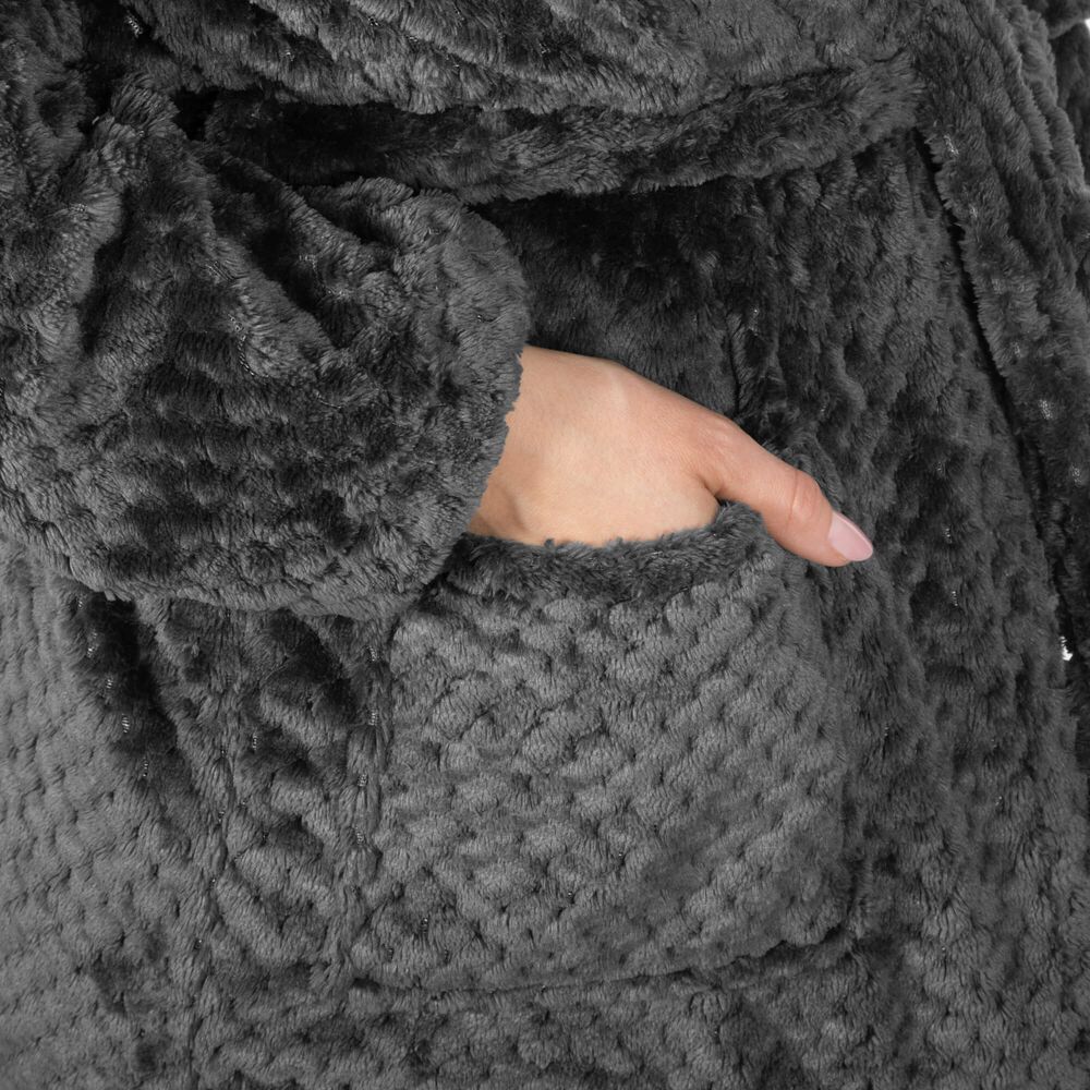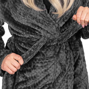 Dlouhý střih poskytuje dostatek tepla a ochrany, zatímco moderní design v elegantní tmavě šedé barvě a s bohatě texturovaným vzorem dodává na atraktivitě. Župan je perfektně navržen tak, aby splňoval nároky na komfort a funkčnost v každodenním používání.