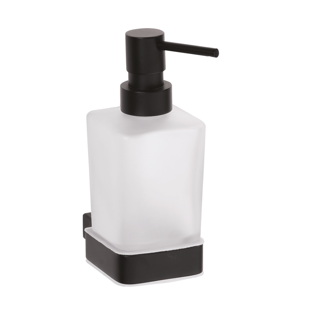 Nástěnný dávkovač tekutého mýdla o objemu 250 ml je vyrobený z mosazi s černou povrchovou úpravou.