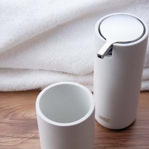 Povrch polyresinových a plastových POM materiálů vyžaduje pravidelné čištění. Volně stojící doplňky lze čistit mýdlovou vodou. Po vyčištění vytřete hadříkem do sucha. Nenechte doplněk stát na umyvadle ve vodě! Působením vody, zbytků mýdla, pasty apod. může dojít k poškození povrchu. Totéž platí i pro bambusové doplňky, které jsou součástí některých volně stojících doplňků. Na odstranění silnějšího znečištění použijte ocet. Roztok by měl působit cca 15 – 20 minut. Po aplikaci je nutné výrobek dobře opláchnout čistou vodou.