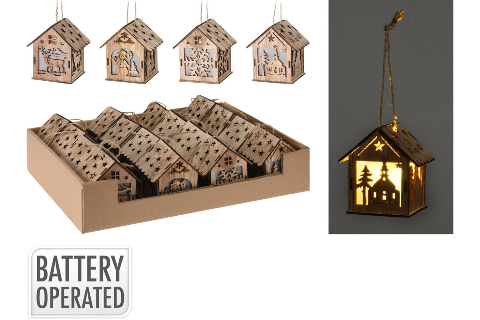 Závěsná dřevěná dekorace domek s LED světlem, různé motivy.