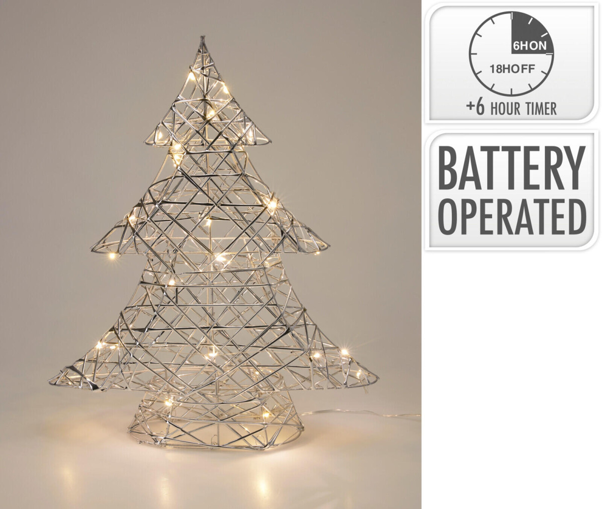 Stříbrný osvětlený stojící stromek navodí tu správnou vánoční atmosféru.
