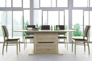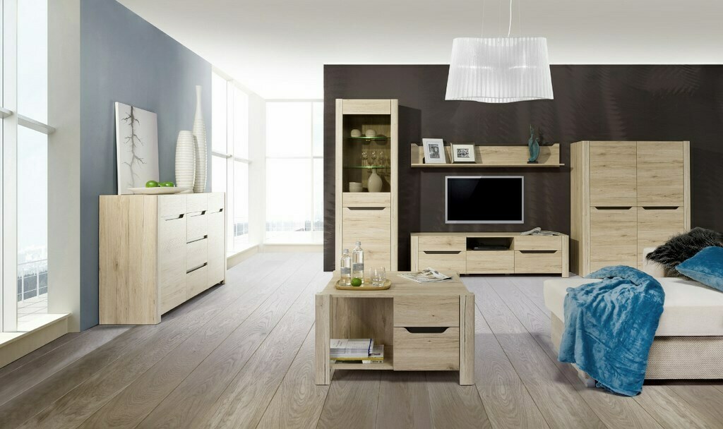 Televizní stolek dvoudveřový se zásuvkou ze sektorové řady DESJO. Tento moderní nábytek je součástí sestavy určené do jídelny nebo obývacího pokoje. Celá řada se vyznačuje úspěšnou kombinací současné a moderní přírodní formy. Jednoduchý styl umocňuje senzační bezúchytový systém nábytku. Vyrábí se z vysoce kvalitní dýhované dřevotřískové desky s fólií. Dekor s 3D efektem vizuálně dává dojem hlubokého povrchu. Široký výběr vám zaručí si sestavit nábytek podle svých představ. Barevné provedení je dub sanremo s dekorativním proužkem hnědé barvy. Nábytek se dodává v demontovaném stavu.