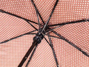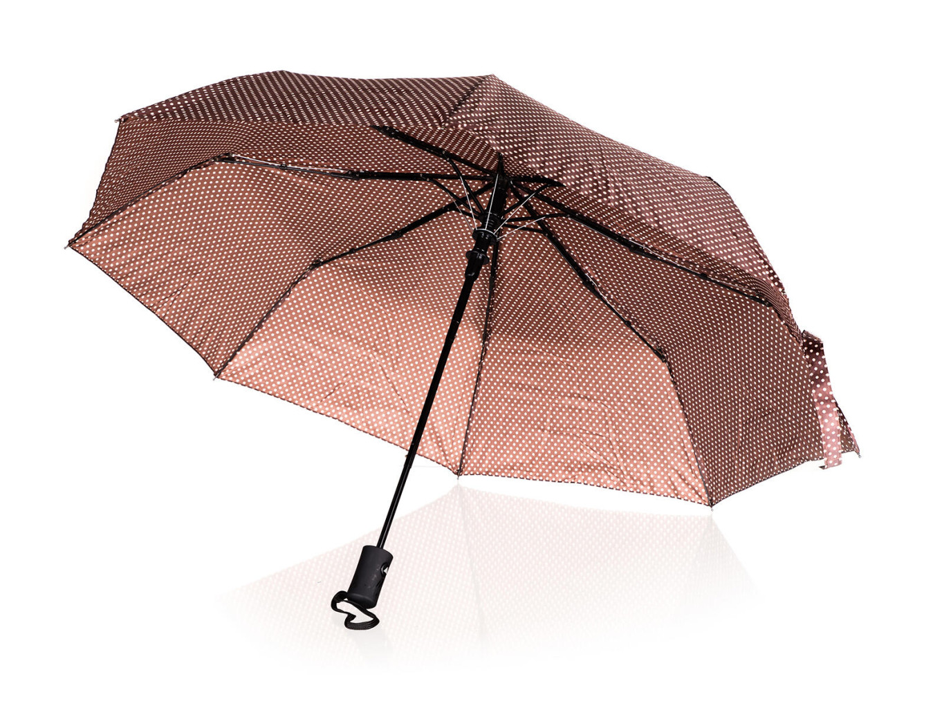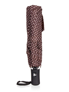Deštník skládací 52 cm v hnědé barvě s puntíky, slouží k ochraně proti dešti a přímému slunci.