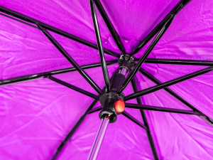 Skládací deštník ve fialové barvě s kočičkami, slouží k ochraně proti dešti a přímému slunci.