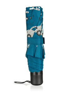 Skládací deštník v modré barvě s autíčky, slouží k ochraně proti dešti a přímému slunci.